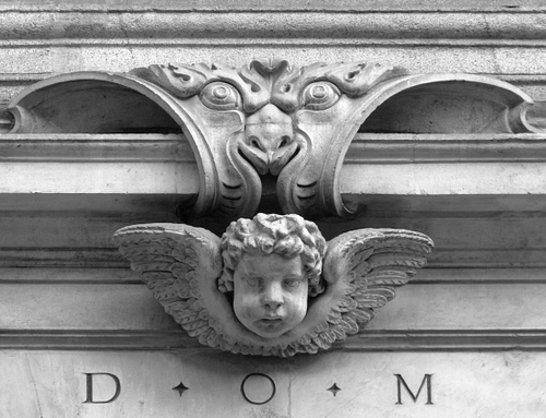 Angeli e demoni convivono a Torino, città centro di magia bianca e nera. Sul portale del Corpus Domini un angelo protegge l'ingresso, ma alle sue spalle, quello che all'apparenza sembra un fregio, altro non è che un volto demoniaco. Che cosa avrà voluto significare il Castellamonte nel disegnarlo ? Probabilmente un avvertimento ai fedeli : "Attenzione il male è sempre in agguato e si nasconde dove meno ce lo aspettiamo.".