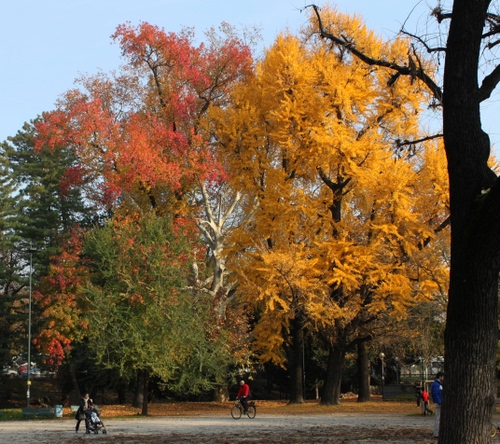 Tag: autunno, alberi, parco, giallo, bicicletta, persone, passeggino, colori, rosso.