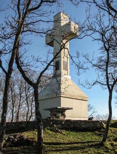 Tag: croce, alberi, monumento, rami, prato, azzurro, erba, verde, pietra, cielo.