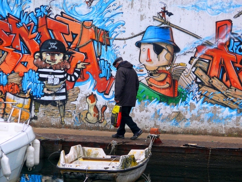 Tag: murales, barche, uomo, passante, barca, banchina, murale, muro, rosso, scritte, solo, anziano, graffiti, acqua, colori, azzurro, persona, molo.
