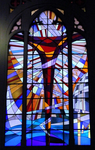 Moderna vetrata con la Croce nella chiesa di Santa Maria delle Grazie al Naviglio, a Milano.