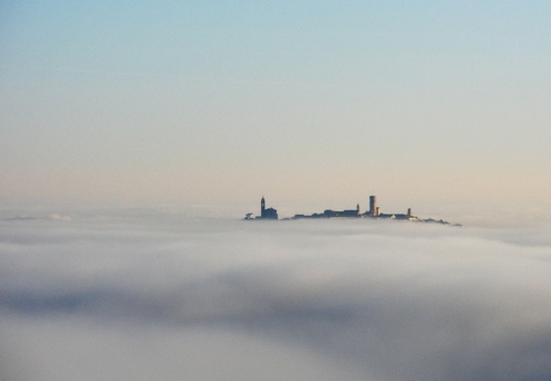 Tag: nebbia, nuvole, cielo, panorama, borgo, paese, bianco, città, campanile, torre.