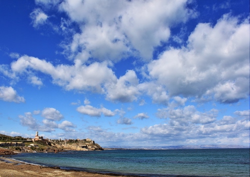 Veduta sulla contrada "scalo mandrie" a Portopalo di Capo Passero,sullo sfondo il castello Tafuri e l'antica tonnara.