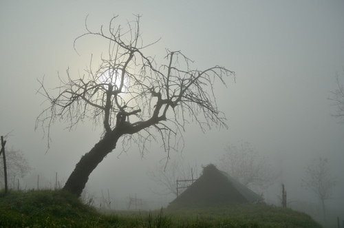Tag: nebbia, albero, sole, rami, inverno, prato, casa, spoglio, foschia.