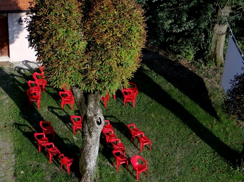 Tag: sedie, albero, prato, rosso, rosse, verde, giardino, alberi.