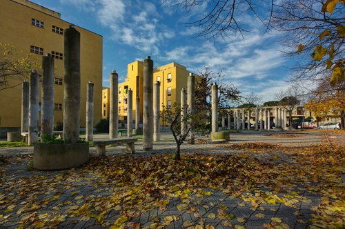 Edilizia popolare nella periferia di Roma, le colonne in origine costituivano il supporto di travature che da anni sono mancanti. Queste strutture restanti conferiscono a questo spazio tra gli stabili un'aria di abbandono.