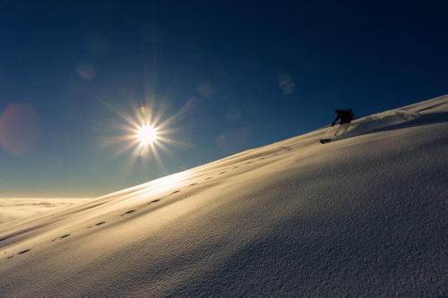 una discesa in neve fresca sull'aquila di giaveno alle prime luci dell'alba
