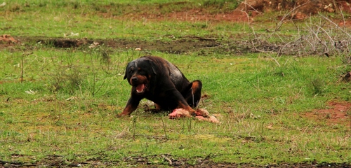 rottweiler abbandonato nelle campagne del salento, caccia per sopravvire, in questo caso è un agnellino a farne le spese.