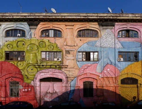 Tag: finestre, murales, colori, palazzo, parabole, casa, cielo, disegni, facce, dipinto, porte, antenne, vetri.