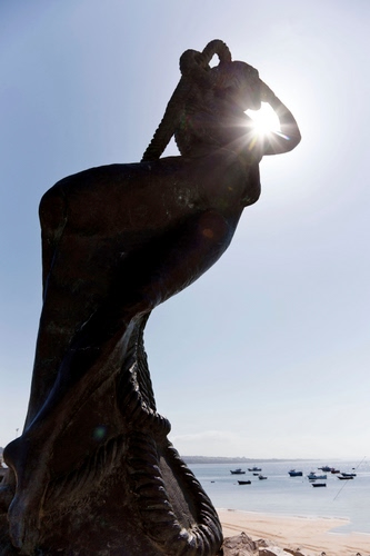 Tag: mare, barche, controluce, statua, sole, acqua, spiaggia, cielo, silhouette, azzurro, raggi, monumento, scultura, sabbia.