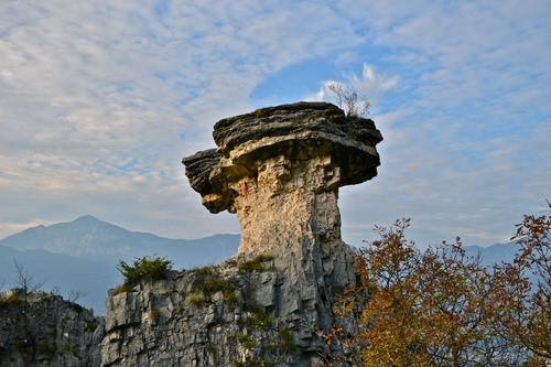 Il fungo di Albaredo. Monolito di roccia calcarea stratificata a forma di fungo, che si trova sul fianco del monte Zugna a pochi chilometri da Rovereto (TN).
