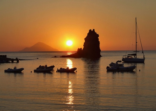 Tag: barche, mare, tramonto, sole, scoglio, controluce, riflesso.