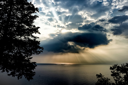 Tag: nuvole, raggi, mare, cielo, alberi, sole, foglie, acqua, controluce, tramonto, riflessi, albero, rami.