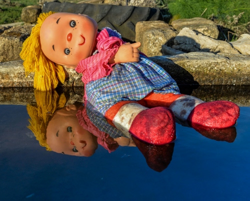 Tag: bambola, acqua, riflesso, giallo, capelli, sassi, giocattolo, pezza.
