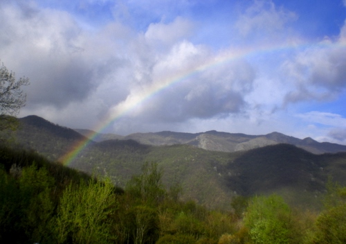 Tag: nuvole, cielo, arcobaleno, alberi, verde, montagne, azzurro, iride, colline, montagna, colori.