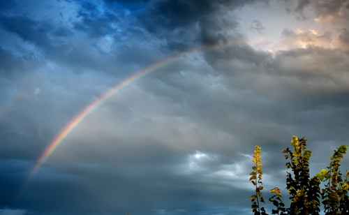 Tag: nuvole, arcobaleno, cielo, rami, foglie, verde, colori, pianta.