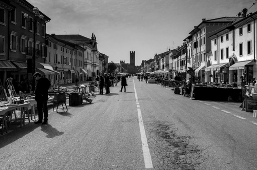 Tag: strada, bianconero, case, mercatino, torre, persone, mercato, bancarelle, passanti.