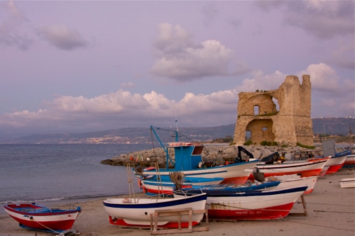 Tag: barche, spiaggia, mare, rudere, torre, nuvole.