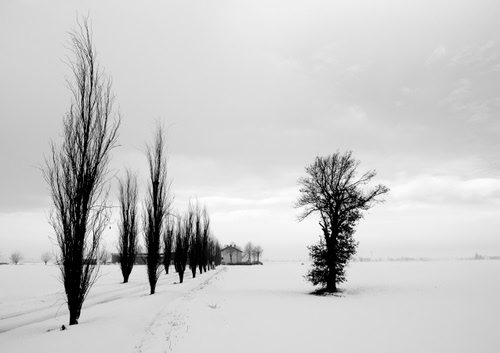 Tag: neve, alberi, bianco, bianconero, inverno, nero, filare, pianura.