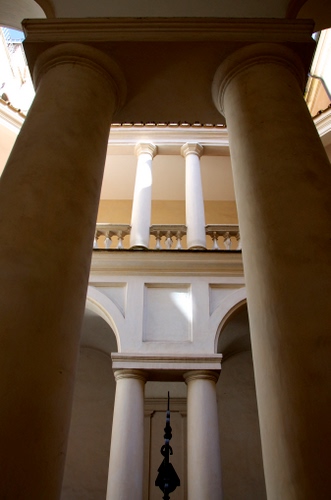 Questo colonnato si trova all'interno della Chiesa di San Carlo alle Quattro Fontane, che si trova a via del Quirinale, Rione Monti, Roma, e all'angolo con il quadrivio di via delle Quattro Fontane la chiesa viene comunemente chiamata "San Carlino", per le sue piccole dimensioni, si dice che è grande quanto un pilone della cupola di San Pietro. Fu edificata insieme all'annesso convento, per volere dei Trinitari spagnoli, nel 1640, dal Borromini. Il piccolo chiostro è di forma ottagonale allungata, scandito da doppie coppie di colonne al cui centro è un elegante pozzo di forma ottagonale.
