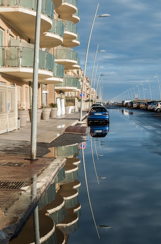 Tag: balconi, lampioni, strada, riflesso, cielo, acqua, riflessi, nuvole, automobile, blu, marciapiede, macchine, macchina, pozzanghera, auto, case.