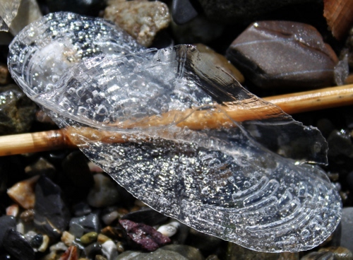 Coso gelatinoso tra sassolini e bastoncelli in riva la mare. Non ho idea di che cosa sia.