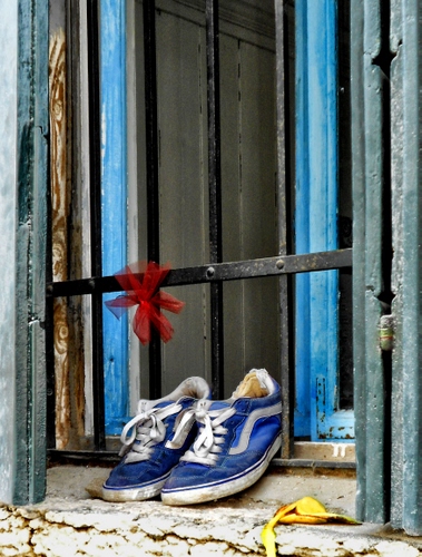 Tag: scarpe, finestra, blu, fiocco, inferriata, azzurro, buccia, rosso, grate, grata.