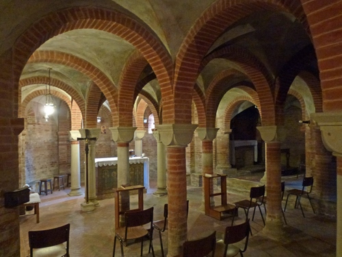 Sala Bolognese : Pieve di S. Maria Annunziata e San Biagio, basilica romanica del XI secolo - “Uno dei più insigni monumenti di stile romanico lombardo che vanta la provincia di Bologna.. La cripta sottostante al presbiterio, provvista di tre altari, mostra le colonnine e le paraste così come erano nella collocazione originaria. Infatti essa è stata ripristinata così come era in antico seguendo le tracce degli archi e delle volte conservatesi soprattutto nell’abside maggiore e nel muro di sostegno della scala. La cripta è certamente la parte più suggestiva della Basilica. Sotto gli archi dipinti (con il simbolo di epoca paleocristiana) nella penombra, lo spirito si raccoglie nel silenzio e si apre naturalmente alla preghiera…” dal sito della Pro Loco di Sala Bolognese http://www.prolocosala.it/basilica.html