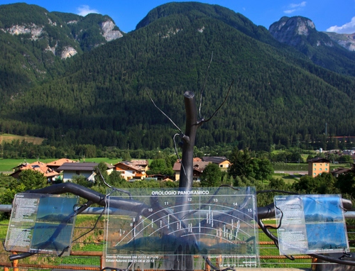 Sulle istruzioni, non leggibili sulla sinistra, si legge: Il profilo della montagna di fronte a voi, con l'ausilio del diagramma qui accanto, è uno strumento sufficiente per conoscere con una discreta precisione, l'ora civile (la stessa che indica il vostro orologio da polso) Ecco come indica l'ora questa "meridiana dipinta dal cielo": 1. trascinate il sole in verticale verso il basso fino a toccare un punto del profilo della montagna (punto A). 2. individuate, lungo il profilo della montagna, riportato sul pannello, il punto "A" e da qui salite la verticale fino ad incrociare, in un punto "B" l'arco corrispondente alla data (il 19/04 nell'esempio 1) 3. a seconda della data scegliere un colore: -rosso- se adesso è inverno o primavera -blu- se adesso è estate o autunno La linea curva delle ore del colore scelto che passa per il punto "B" vi conduce all'ora indicata sull'arco più esterno (ore 9 nell'esempio). Seguono alcune note. La guida che ci ha portato a conoscere le varie meridiane del Paese, ci ha dimostrato la sufficiente precisione di quella che a noi è stata venduta come "meridiana". L'ho postata convinto che avrebbe suscitato interesse e curiosità pur rendendomi conto che non avrebbe avuto molte preferenze! Se avrai occasione di passare dalla Val di Sole ti consiglio una visita al paese. ![]() |