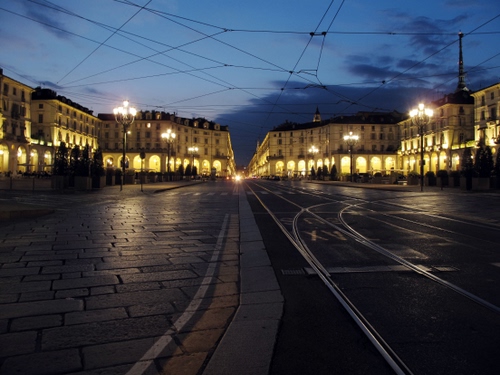 Particolare, con i fili del tram in cielo. Belli anche i palazzi illuminati. Forse bisognava tagliare un po' di pavimentazione.