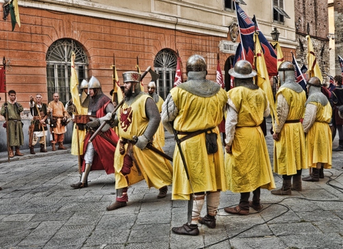 Tag: giallo, bandiere, elmi, strada, medioevo, soldati, costumi, armi, armature, rosso, divise.
