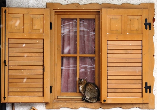 Un gatto sulla finestra, ma inizia a nevicare e sembra in attesa che qualcuno apra per farlo entrare.