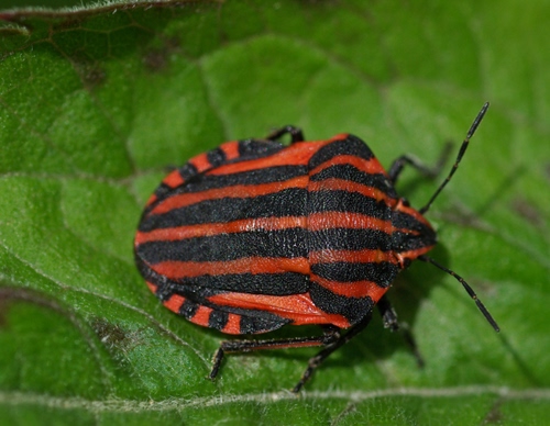 Tag: verde, insetto, foglia, nero, rosso, cimice, strisce, bicolore.