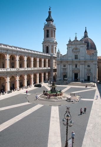 Tag: piazza, fontana, chiesa, campanile, cupola, persone, archi, lampione, portici, loreto.