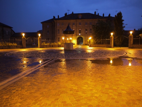 Tag: piazza, luci, lampioni, notte, notturno, sera, arco, giallo, pioggia.
