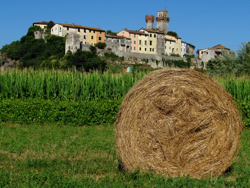 una bella immagine Giorgio anche se personalmente, forse sbagliando mi sarei un po' allontanta dalla balla di fieno per farla venire un po' meno presente; magari abbassandoti saresti riuscito a nascondere le case |