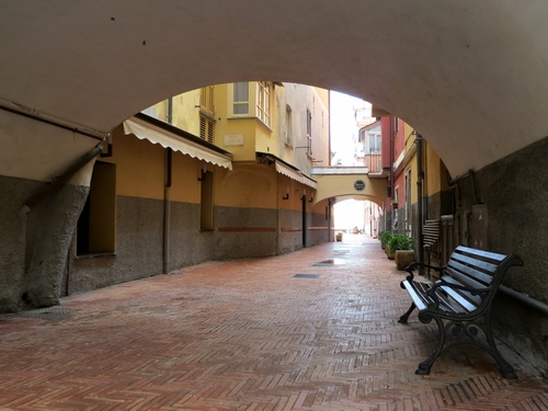 Questo largo sotto ai portici è una piccola piazza di Laigueglia: Piazza Canosso.