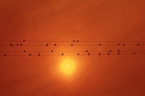 Tag: uccelli, fili, sole, arancione, cielo, tramonto, rosso.