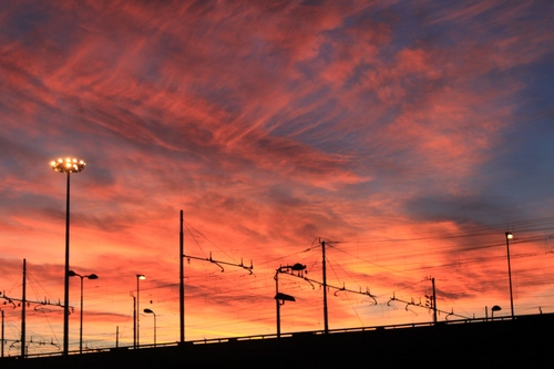 Tag: tramonto, rosso, lampioni, fili, pali, nuvole, luci, ferrovia, binari, lampione, luce.