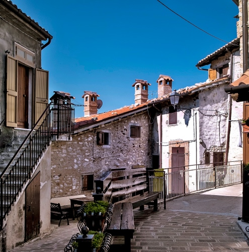 Tag: comignoli, panchine, scala, ringhiera, borgo, porta, paese, cielo, case.
