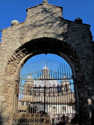 bella composizione - il cancello fa da cornice alla chiesa |