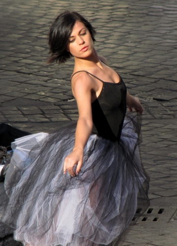 Non era uno spettacolo. Era una modella in posa per un fotografo con relativo contorno di aiutanti con ombrelli e pannelli riflettenti. Ovviamente non mancavano i curiosi. Delle varie foto scattate (da circa un terzo della Scalinata di Trinità dei Monti) questa è l'unica che sono riuscito ad ottenere con lo sfondo pulito. In tutte le altre era impossibile eliminare la presenza di curiosi, collaboratori del fotografo e attrezzature fotografiche sparse disordinatamente sul selciato. |