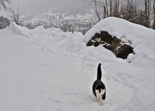 Tag: neve, gatto, inverno, bianco, nero, montagna, paese, paesaggio, rami, animale.