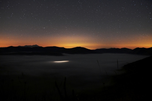 Notturno realizzato a Castelluccio realizzato con la Nikon D600 e obiettivo 24/70mm F/2,8. Per la mia prima uscita notturna, con la nebbia che stava salendo in quel momento passava un auto e o realizzato questo scatto.