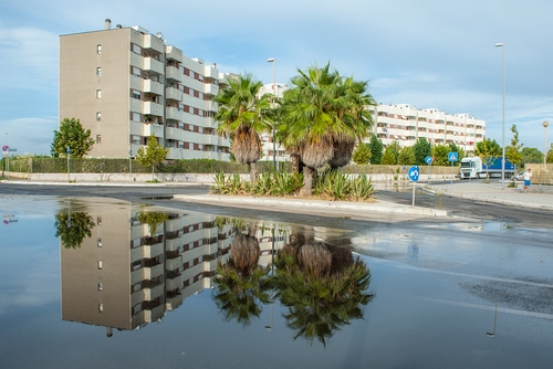 Tag: acqua, riflesso, palme, alberi, strada, palazzo, cielo, balconi, lampioni, verde, camion, palazzi, pozzanghera, riflessi, case.