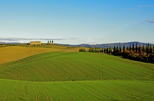 Tag: verde, colline, casa, alberi, panorama, prati, cielo, campi, campagna, cipressi, paesaggio.
