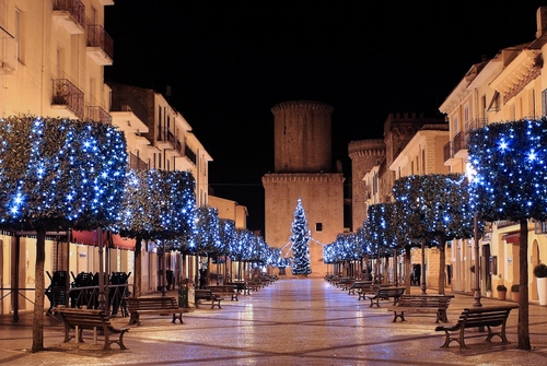 Tag: panchine, luci, alberi, piazza, notte, natale, torre, luminarie, castello, riflessi, notturno.