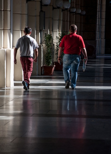 Tag: due, rosso, ombre, persone, uomini, lampioni, corridoio, pavimento, riflesso, marmo, portico, marciapiede, bianco, riflessi, piante, passanti, pianta.