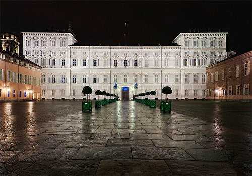 Tag: piazza, palazzo, notturno, notte, prospettiva, luci, pioggia, riflessi, vasi, alberi.
