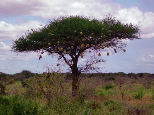 Tag: albero, nuvole, verde, cielo, nidi, savana, rami.